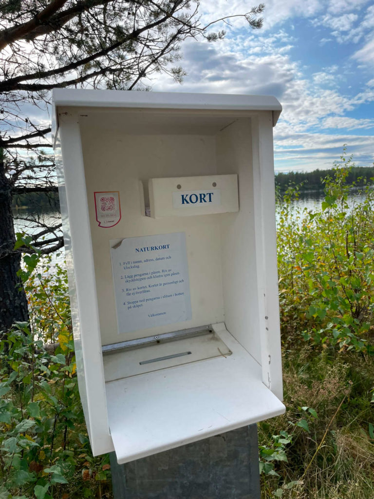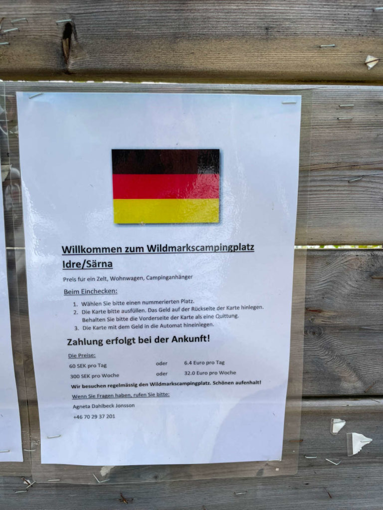 Auf dem Rückweg vom Naturreservat haben wir dann noch andere Stellplätze direkt am Fluss Älvrosfjorden entdeckt. Auf der Hauptstraße zwischen Idre und Särna sehen wir immer wieder Schilder mit der Aufschrift Lägerplats. Hier handelt es sich tatsächlich um einfache, naturbelassene Stellplätze für kleines Geld, die extra eingerichtet worden, damit die Natur an anderen Stellen auch wirklich naturbelassen bleibt. Informationsschilder gibt es sogar in deutscher Sprache, einfach die Karte ausfüllen und das Geld dazu packen, fertig.