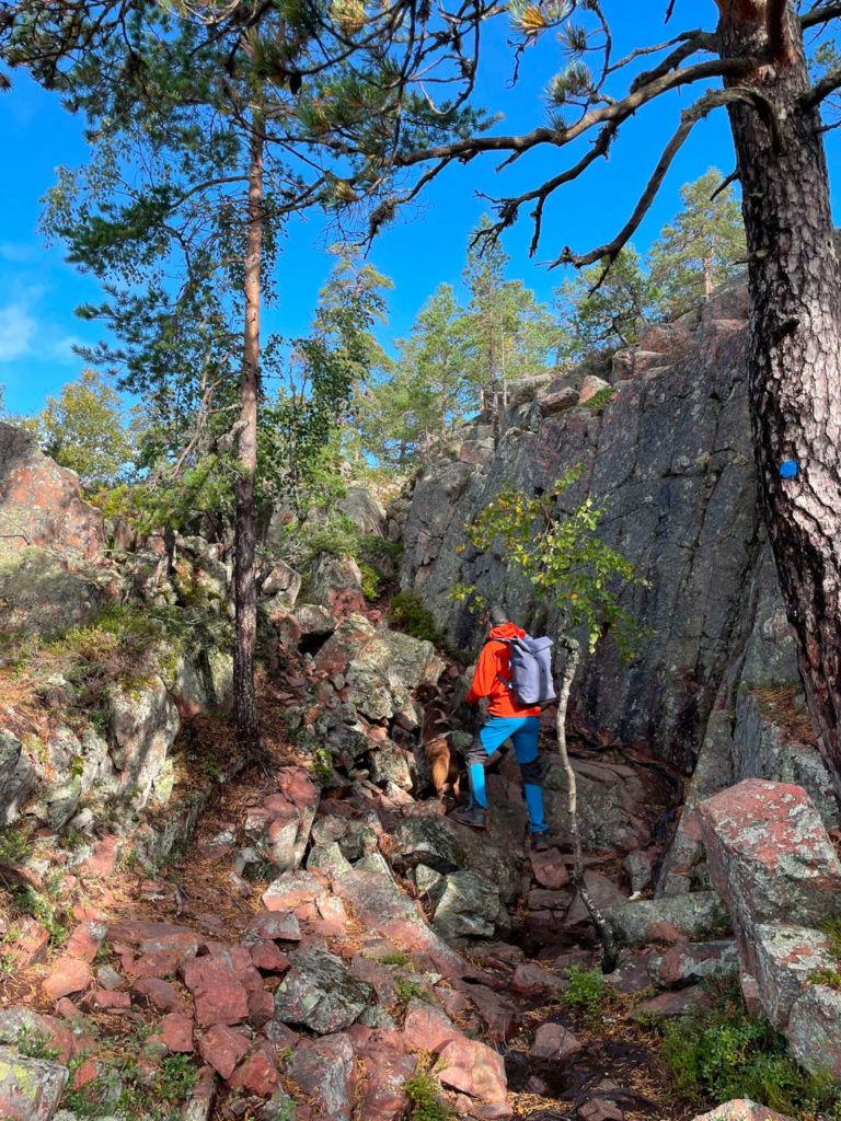 Am Skuleskogen Nationalpark an der Schweden Ostküste genießen wir eine Wanderung, bei der wir uns durch schroffe Felsen und malerische Schärenlandschaften bewegen. Wir planen, durch die Schlucht zu wandern. Mit Hund ist das allerdings schwierig: Die Wege sind sehr steinig, einige Abschnitte sind kaum geeignete Hundewege. Oben angekommen, werden wir belohnt: Wir haben eine atemberaubende Aussicht auf die umliegende Küste.